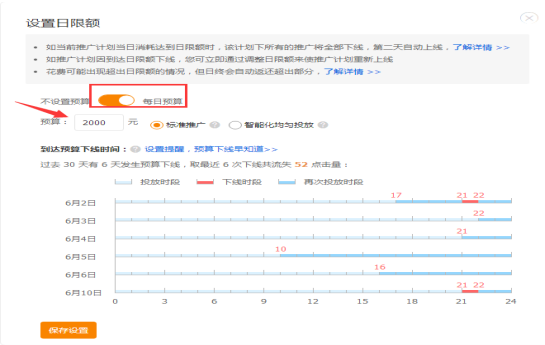 前期结合个人预算,一天一般设置150到200元。具体可结合实际关键词出价、扣费以及预计投入;预算越大数据越多,数据越精准;设置30元左右,是相对比较少的,计划获取不到数据,不准确,没有太大价值。推广方式选择标准投放即可,根据投放设置正常展现,超出预算即下线,数据相对更准确。智能投放是根据日限额和流量均匀投放,