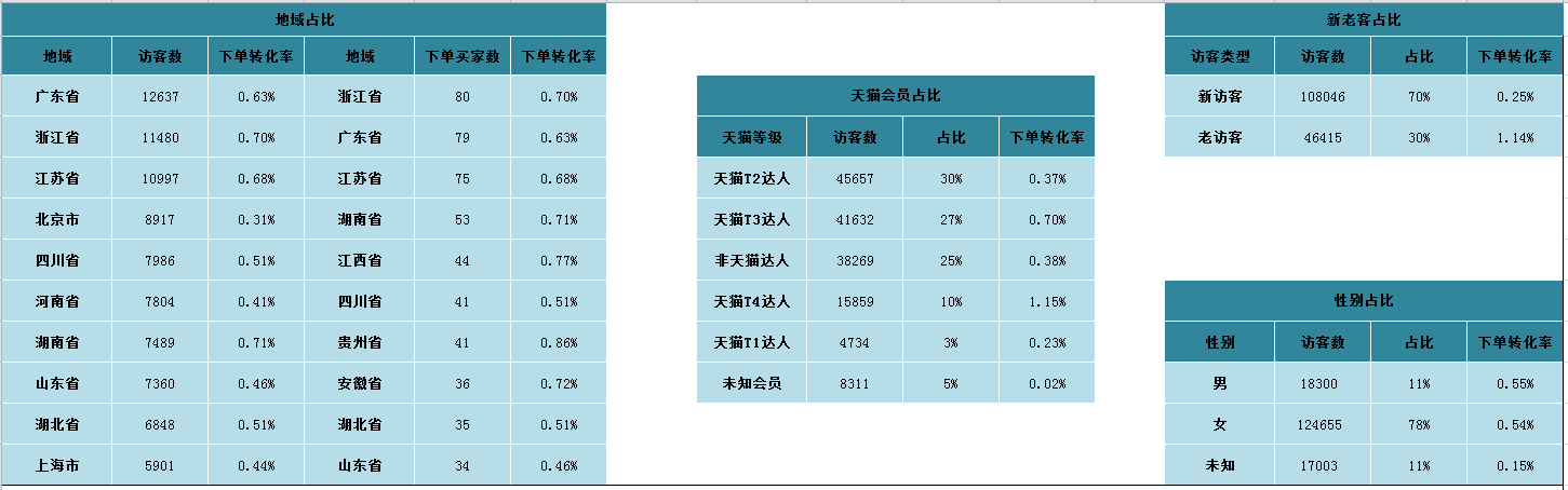 天猫等级,性别,新老访客也是一样,记录在表格里面。