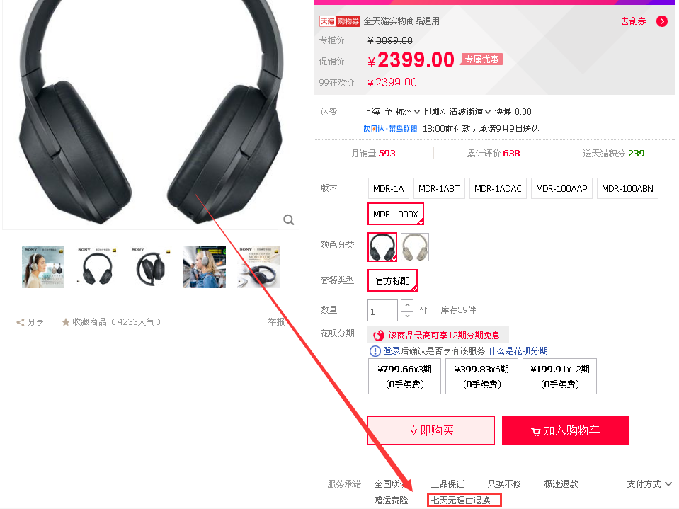 (图注:搜索同款耳机苏宁与天猫仍支持7天无理由退换)